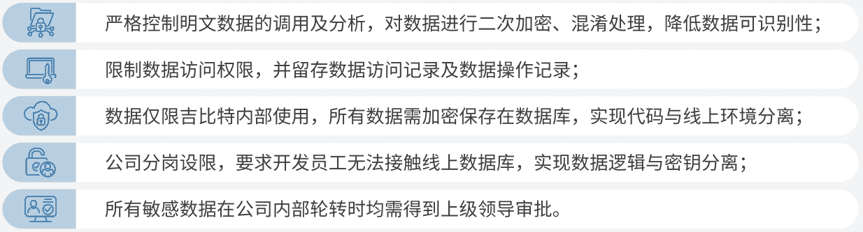 公司對用戶個人信息實施脫敏處理,,,嚴格限制用戶信息用途,,數據使用完成后集中歸檔處理。。為進一步確保數據處理過程的安全,,公司根據實際的業務工作分崗設限,,,,最大程度保護數據隱私安全,,,如在生產網絡中的加密數據由研發部門員工負責編寫加、、、、解密程序,,,但其無法直接訪問到加密后的數據庫;程序的加、、、、解密密鑰由運維員工單獨配置。。。